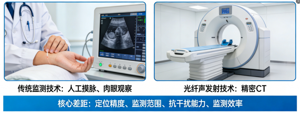 如果把基础设施比作我们的身体,监测技术就是“体检方式”——传统监测技术,就像是靠医生人工摸脉、肉眼观察,靠经验判断哪里出了问题;而光纤声发射技术,就像是给身体做了一次全面的精密CT,能精准捕捉到细微的异常,还能精准定位问题所在。两者的核心差距,主要体现在4个关键方面:定位精度、监测范围、抗干扰能力与监测效率。