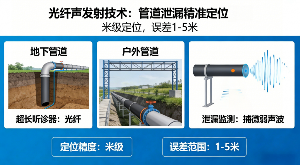 而光纤声发射技术,堪称“精准定位高手”,能直接实现米级定位,误差通常在1-5米。它就像给管道装了一根“超长听诊器”,这根“听诊器”(光纤)能沿着管道全程铺设,不管管道埋在地下还是架在户外,只要发生泄漏,产生的微弱声波都会被光纤捕捉到。设备通过计算光信号的传播时间差,就能精准算出泄漏点的位置,相当于直接给出“门牌号”,工作人员赶到现场就能快速找到问题,及时处置,从根源上减少事故风险。