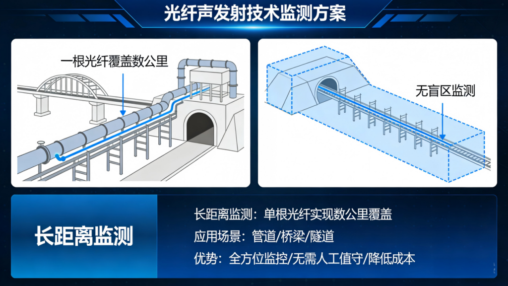 光纤声发射技术则完美解决了这个问题,一根光纤就能实现数公里的长距离无盲区监测。不管是几百公里的管道,还是大型桥梁、隧道,只要铺设一根光纤,就能全程覆盖,相当于给整个基础设施装了一套“全方位监控”,没有任何遗漏,而且不需要大量人工值守,大大降低了监测成本。